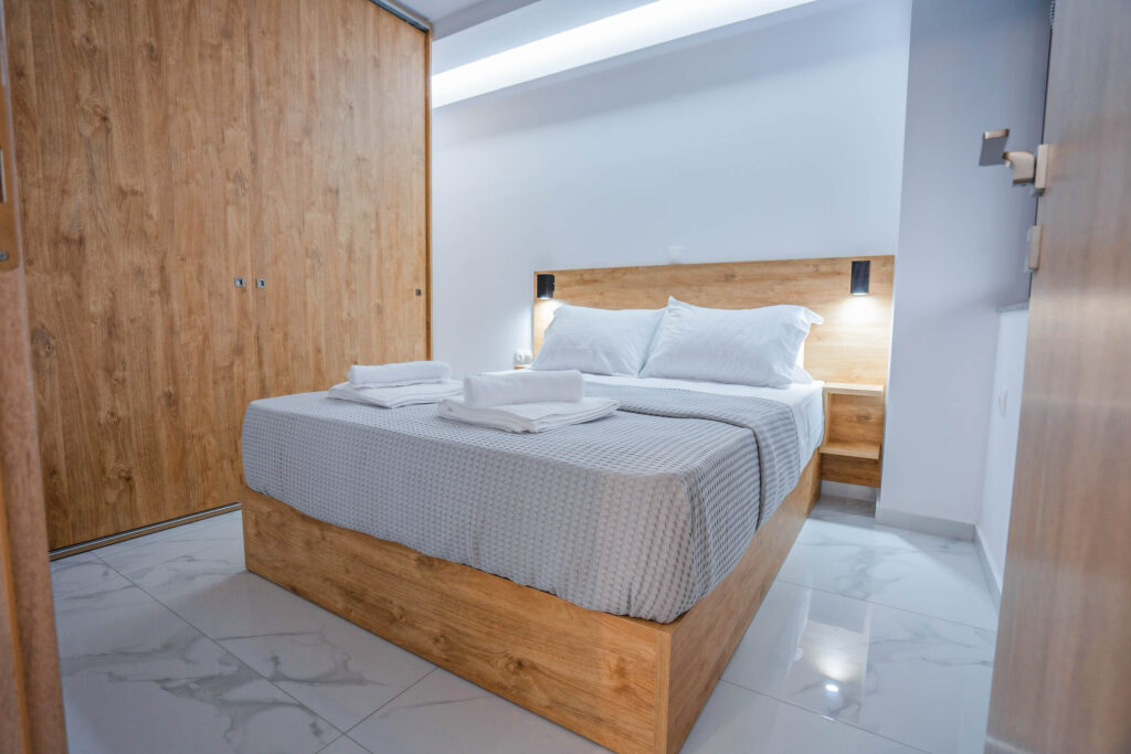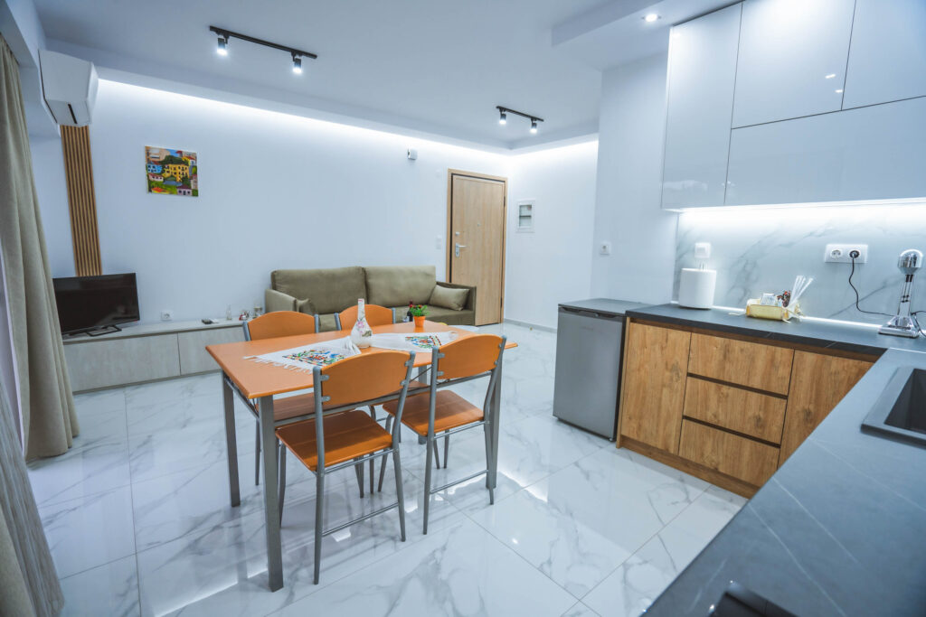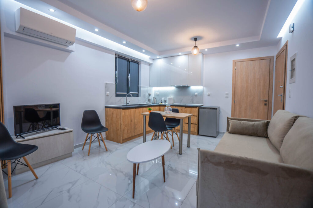 εξοπλισμένη κουζίνα με ψυγείο και κλιματιστικό τελευταίας γενιάς για να έχεις την ιδανική ατμόσφαιρα όλες τις εποχές. Τέλος το κάθε δωμάτιο διαθέτει από ένα διπλό κρεβάτι, από μια smart τηλεόραση και μεγάλες ντουλάπες.